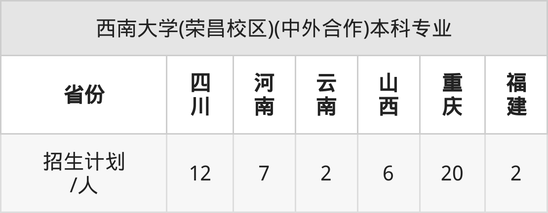 西南大学(荣昌校区)(中外合作)面向四川(12人)、河南(7人)、云南(2人)、山西(6人)、重庆(20人)、福建(2人)开展本科招生。其中山西招生批次为第一批本科A1类,其余省份为本科批。