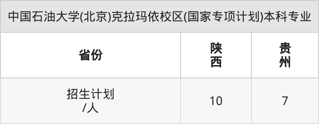 中国石油大学(北京)克拉玛依校区(国家专项计划)面向陕西(10人)、贵州(7人)开展本科招生。招生批次为本科一批。