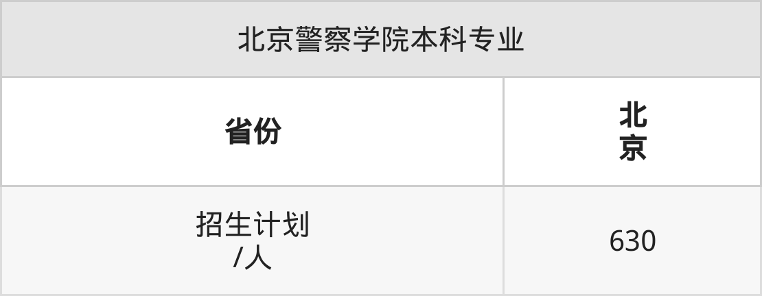 2024年北京警察学院面向全国招收630人,均为本科招生计划。招生专业中本科专业有8个,包含侦查学、治安学,招生省份为北京。