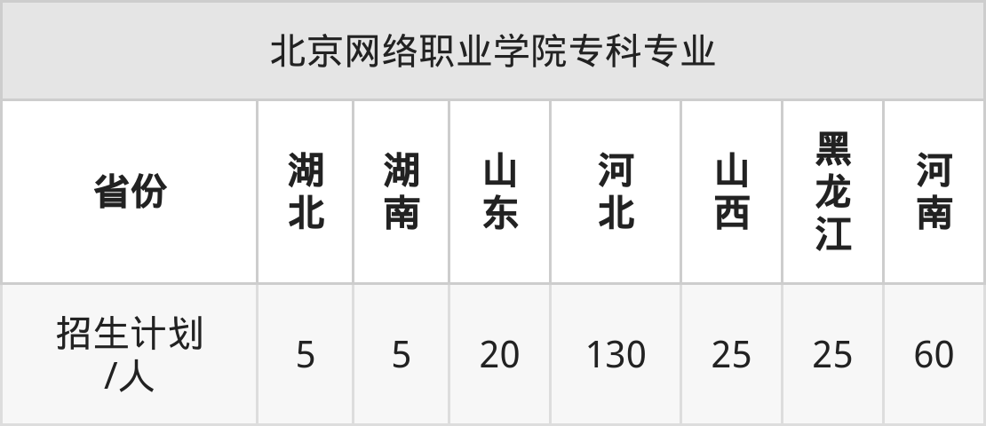 北京网络职业学院面向湖南(5人)、山东(20人)、河北(130人)、山西(25人)、黑龙江(25人)、河南(60人)、湖北(5人)等7个地区开展专科招生。其中山东招生批次为二段,其余省份为专科批。