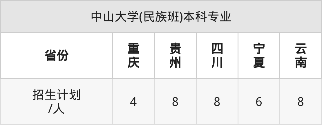 中山大学(民族班)面向重庆(4人)、贵州(8人)、四川(8人)、宁夏(6人)、云南(8人)开展本科招生。其中宁夏招生批次为第一批本科,其余省份为本科批。