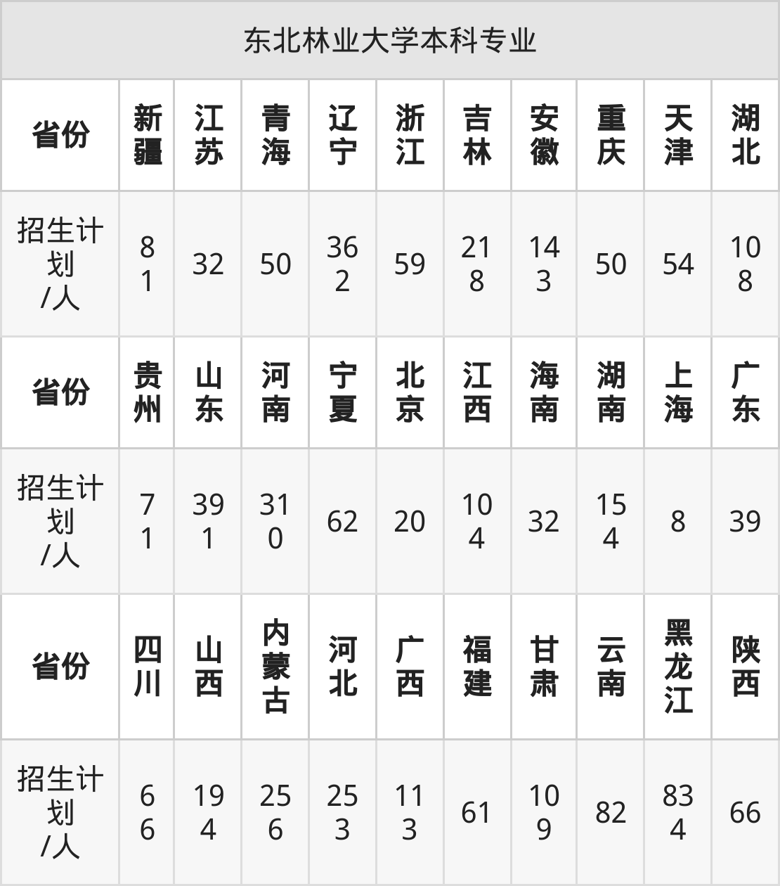 东北林业大学面向甘肃(109人)、江西(104人)、湖南(154人)、贵州(71人)、山西(194人)、浙江(59人)、内蒙古(256人)等30个地区开展本科招生。其中四川、新疆、河南、内蒙古、陕西招生批次为本科一批,其余省份为本科批。