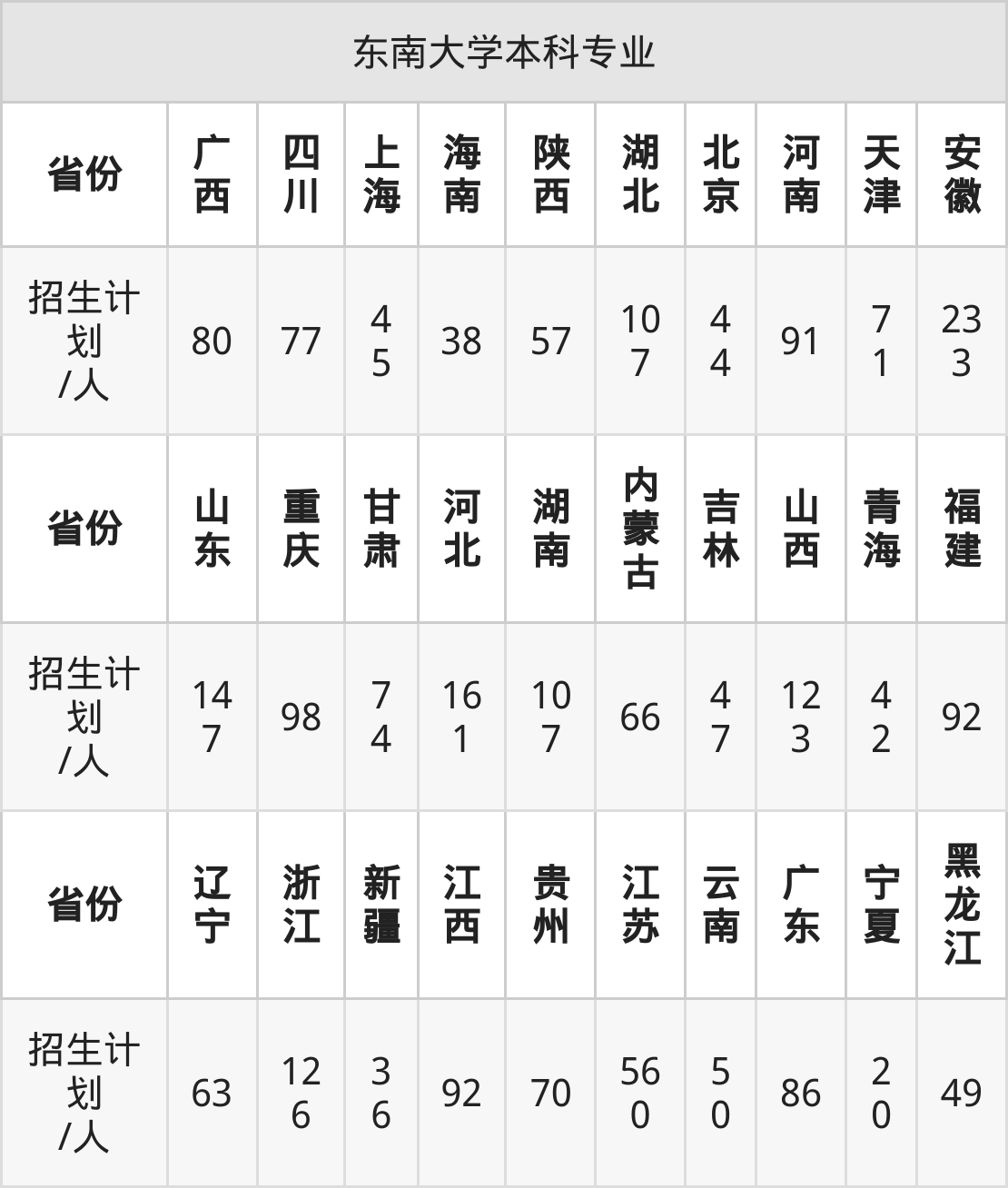 东南大学面向上海(45人)、山东(147人)、天津(71人)、广东(86人)、广西(80人)、黑龙江(49人)、江西(92人)等30个地区开展本科招生。其中云南招生批次为一本,河南、内蒙古、四川、陕西、新疆招生批次为本科一批,其余省份为本科批。