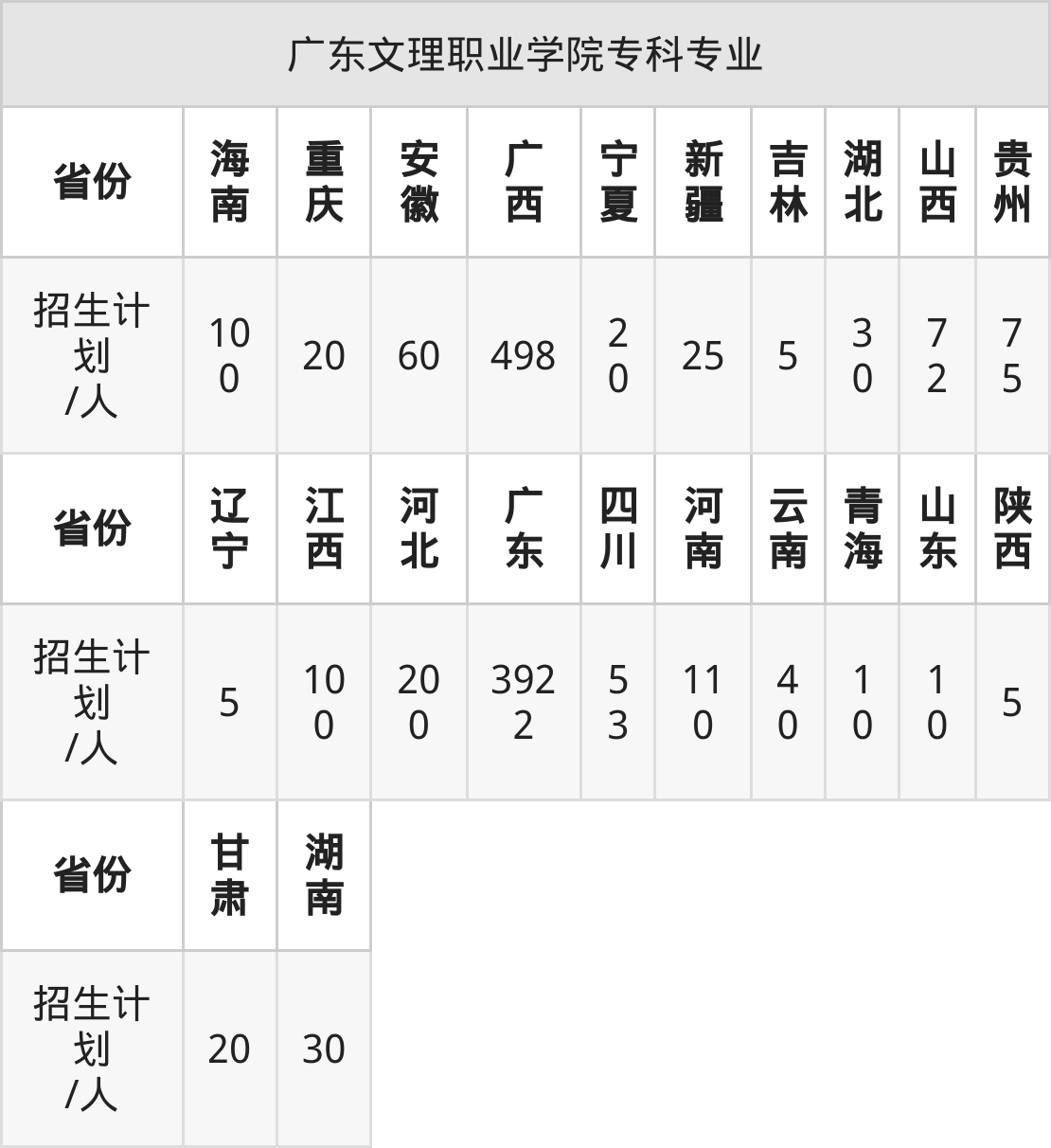 广东文理职业学院面向甘肃(20人)、新疆(25人)、青海(10人)、湖北(30人)、湖南(30人)、江西(100人)、海南(100人)等22个地区开展专科招生。其中山东招生批次为二段,其余省份为专科批。