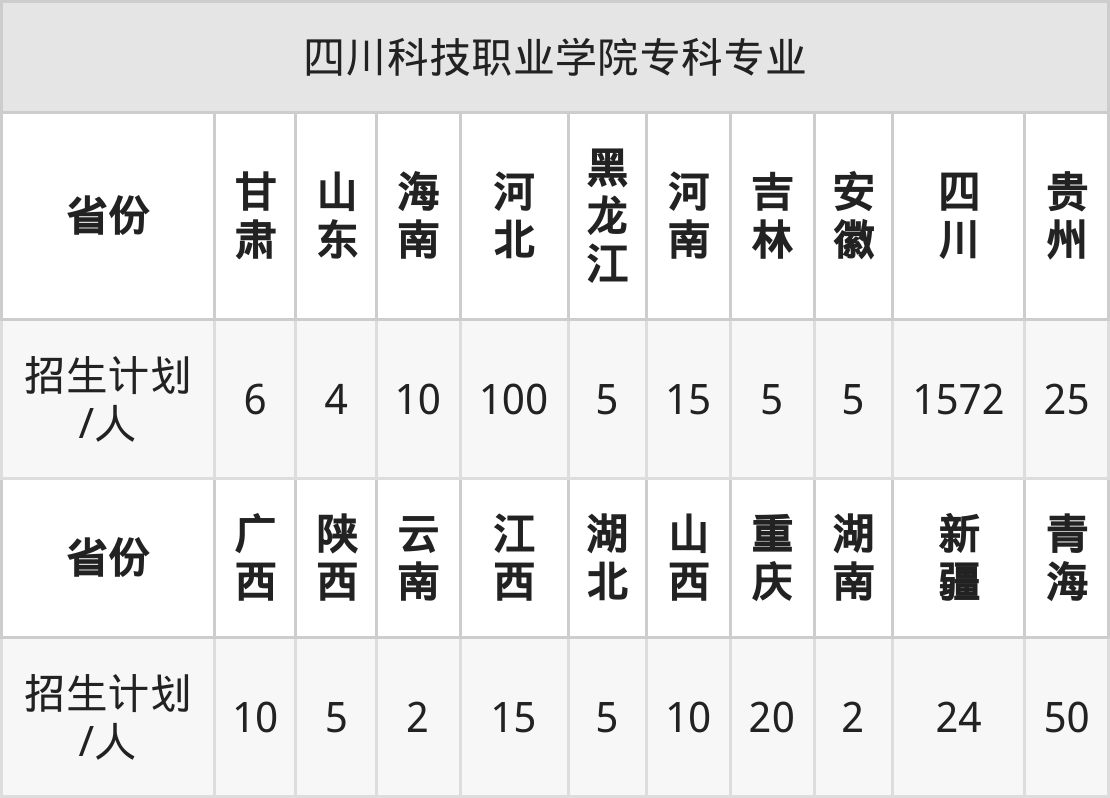 四川科技职业学院面向甘肃(6人)、河南(15人)、山西(10人)、四川(1572人)、广西(10人)、陕西(5人)、重庆(20人)等20个地区开展专科招生。其中山东招生批次为二段,其余省份为专科批。