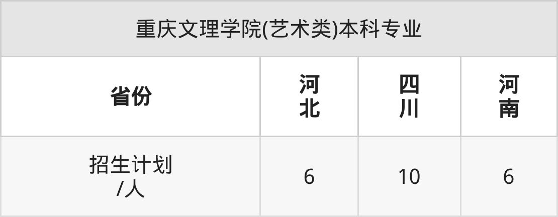 重庆文理学院(艺术类)面向河北(6人)、四川(10人)、河南(6人)开展本科招生。其中河北招生批次为本科批,其余省份为本科二批。