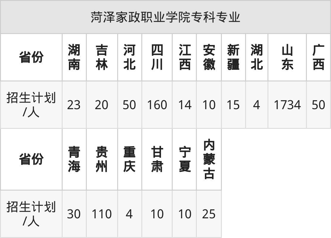 菏泽家政职业学院面向山东(1734人)、河北(50人)、甘肃(10人)、新疆(15人)、吉林(20人)、江西(14人)、内蒙古(25人)等16个地区开展专科招生。其中山东招生批次为二段,其余省份为专科批。