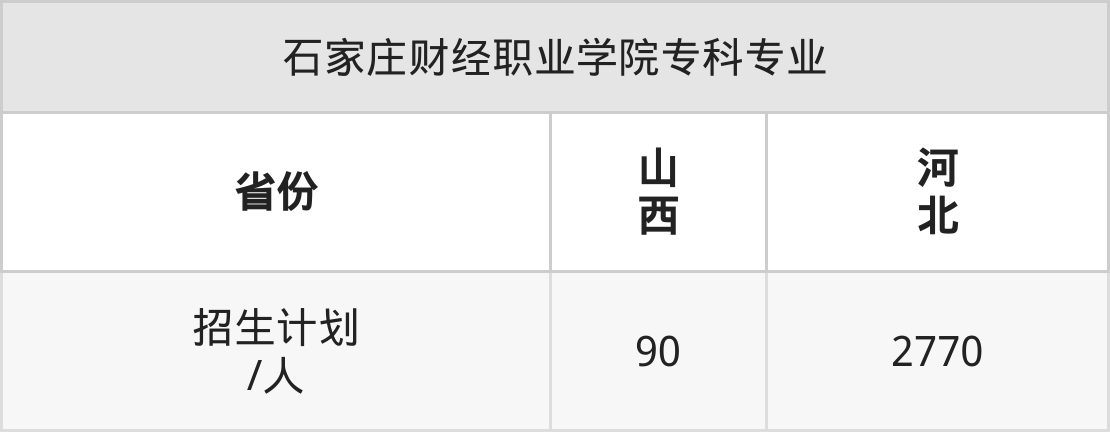 石家庄财经职业学院面向河北(2770人)、山西(90人)开展专科招生。招生批次为专科批。