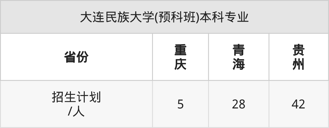 大连民族大学(预科班)面向贵州(42人)、重庆(5人)、青海(28人)开展本科招生。招生批次为本科批。