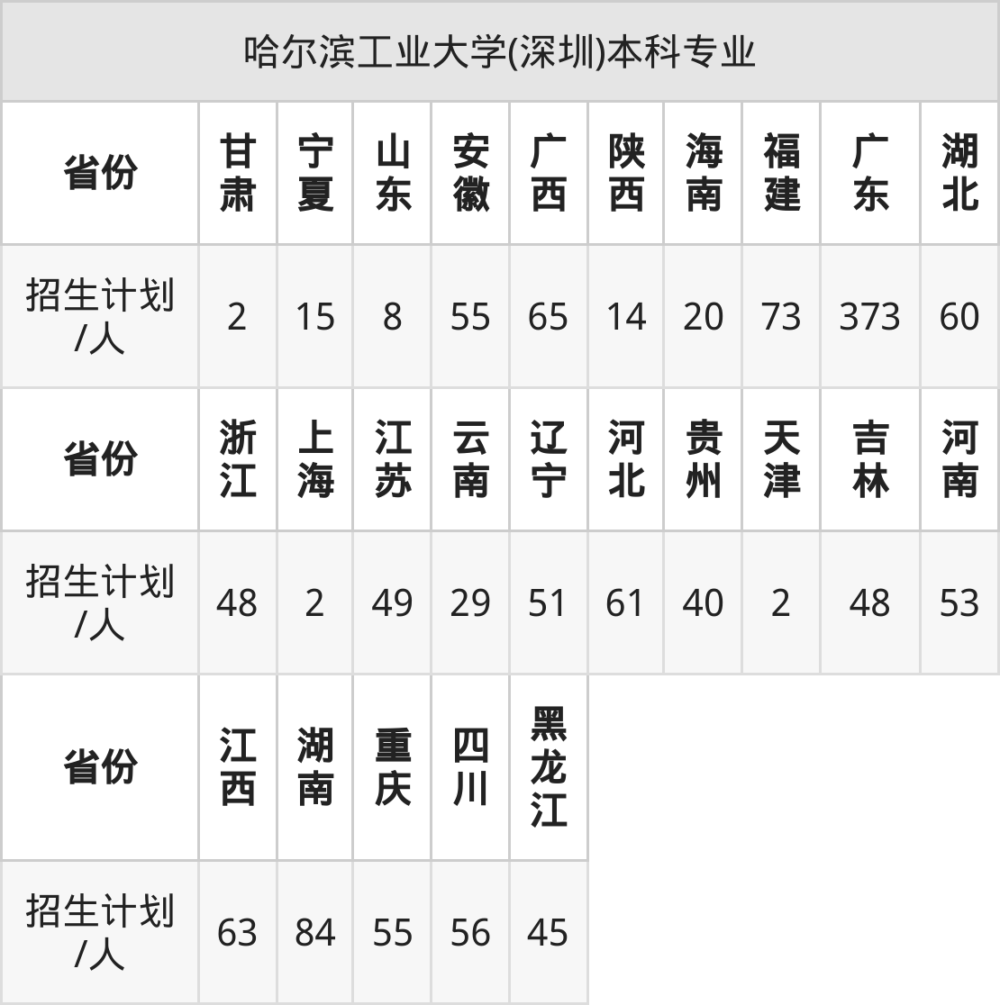 哈尔滨工业大学(深圳)面向宁夏(15人)、吉林(48人)、湖北(60人)、湖南(84人)、河北(61人)、四川(56人)、黑龙江(45人)等25个地区开展本科招生。其中云南招生批次为一本,陕西、四川、河南招生批次为本科一批,其余省份为本科批。