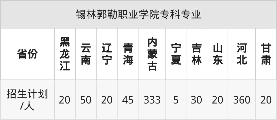 锡林郭勒职业学院面向山东(20人)、河北(360人)、黑龙江(20人)、甘肃(20人)、宁夏(5人)、云南(50人)、辽宁(20人)等10个地区开展专科招生。其中山东招生批次为二段,其余省份为专科批。