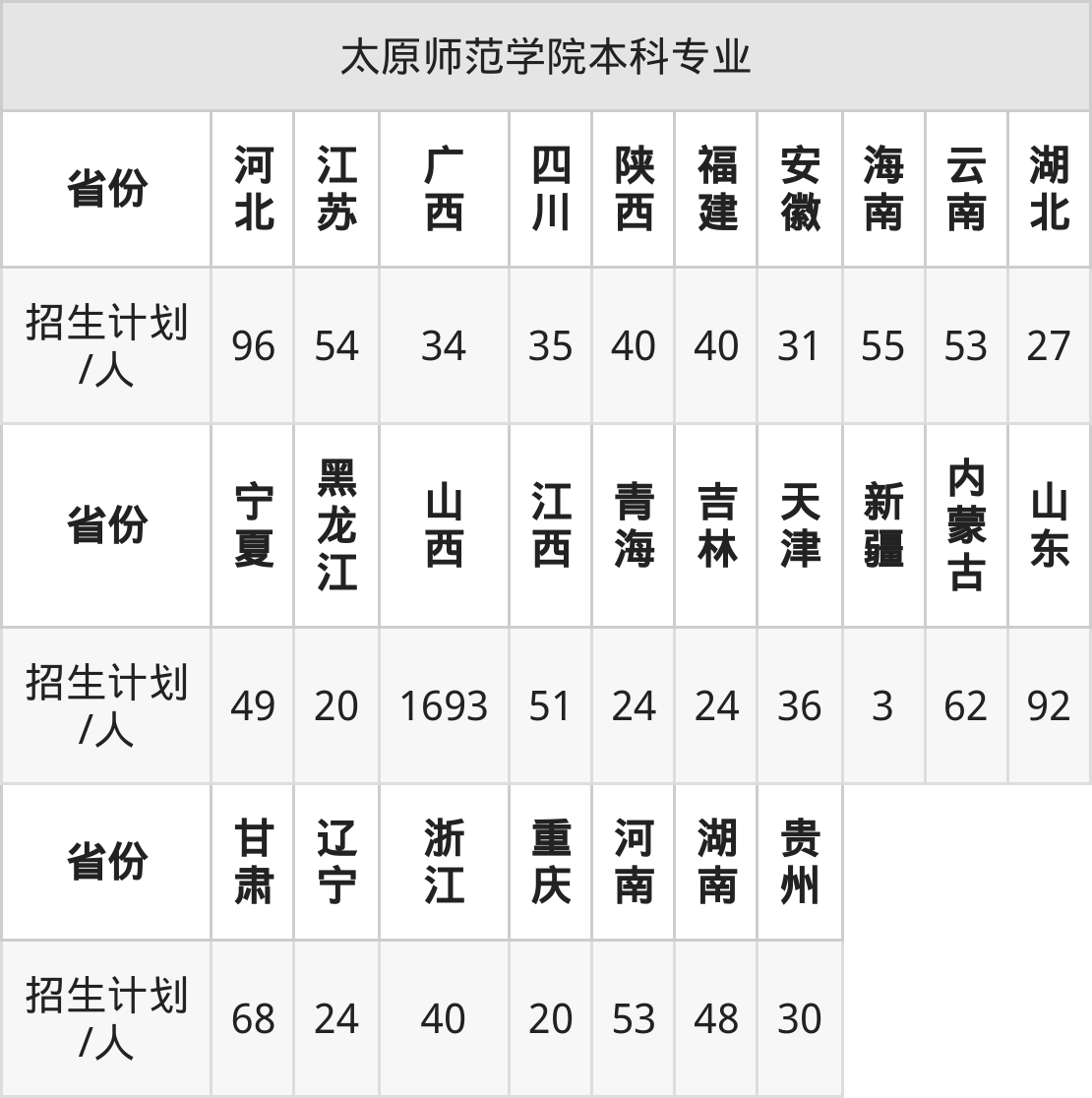 太原师范学院面向重庆(20人)、贵州(30人)、四川(35人)、江苏(54人)、山东(92人)、浙江(40人)、青海(24人)等27个地区开展本科招生。其中四川、新疆、河南、内蒙古、陕西招生批次为本科二批,其余省份为本科批。