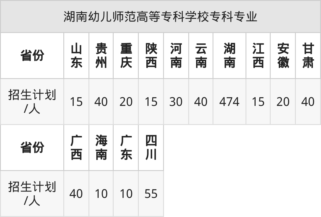 湖南幼儿师范高等专科学校面向四川(55人)、河南(30人)、江西(15人)、海南(10人)、广东(10人)、云南(40人)、甘肃(40人)等14个地区开展专科招生。其中山东招生批次为二段,其余省份为专科批。
