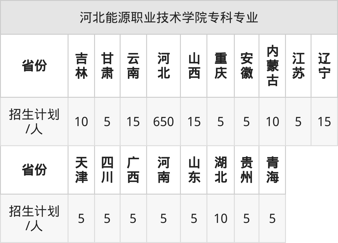 河北能源职业技术学院面向湖北(10人)、内蒙古(10人)、河北(650人)、四川(5人)、广西(5人)、青海(5人)、云南(15人)等18个地区开展专科招生。其中山东招生批次为二段,其余省份为专科批。