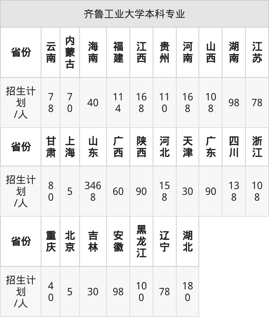 齐鲁工业大学面向甘肃(80人)、湖南(98人)、江苏(78人)、山西(108人)、安徽(98人)、云南(78人)、湖北(180人)等27个地区开展本科招生。其中内蒙古、河南招生批次为本科一批,其余省份为本科批。