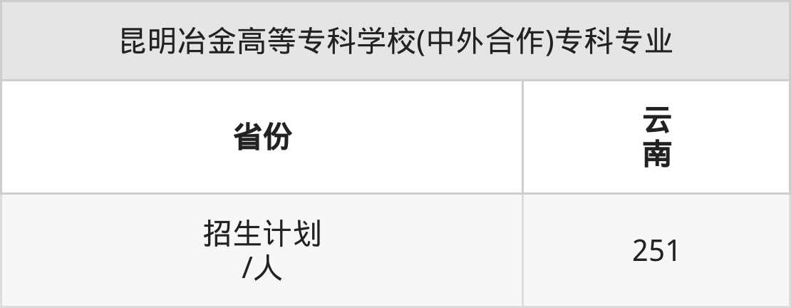 昆明冶金高等专科学校(中外合作)面向云南(251人)开展专科招生。招生批次为专科批。