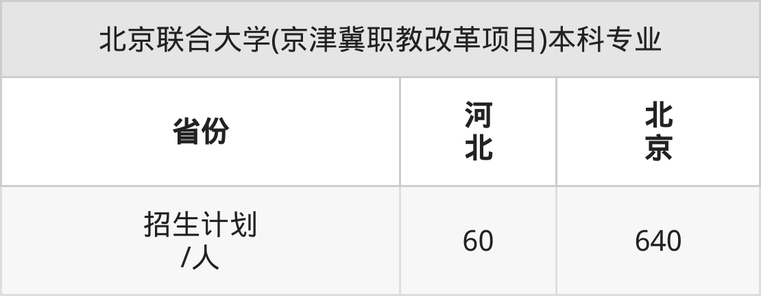 北京联合大学(京津冀职教改革项目)面向河北(60人)、北京(640人)开展本科招生。招生批次为本科批。