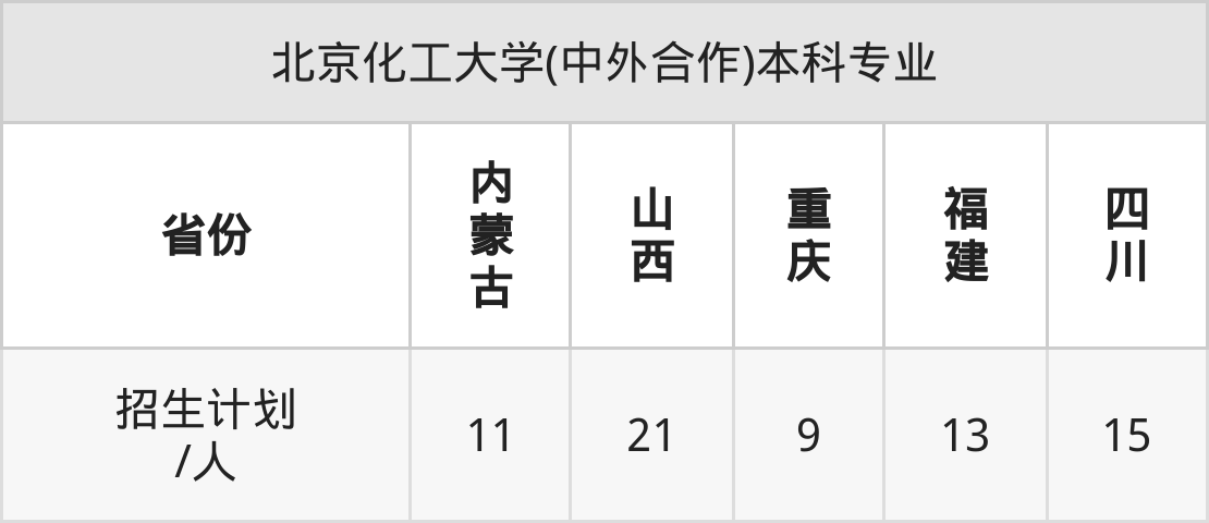 北京化工大学(中外合作)面向山西(21人)、重庆(9人)、福建(13人)、四川(15人)、内蒙古(11人)开展本科招生。其中山西招生批次为第一批本科A1类,其余省份为本科一批。