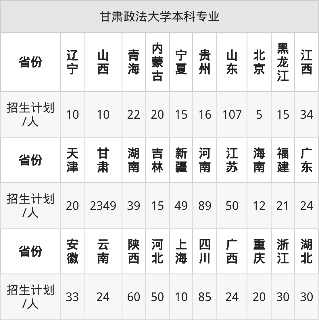 甘肃政法大学面向内蒙古(20人)、宁夏(15人)、安徽(33人)、福建(21人)、新疆(49人)、青海(22人)、河北(50人)等30个地区开展本科招生。其中天津招生批次为本科批A段,宁夏、云南、四川招生批次为本科批B段,其余省份为本科批。