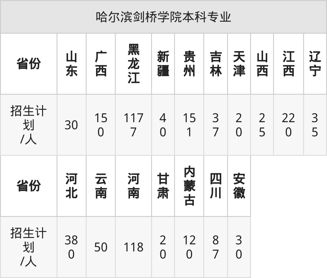 哈尔滨剑桥学院面向云南(50人)、江西(220人)、山东(30人)、贵州(151人)、甘肃(20人)、河南(118人)、吉林(37人)等17个地区开展本科招生。其中山东招生批次为一段,内蒙古、新疆、四川、河南招生批次为本科二批,其余省份为本科批。