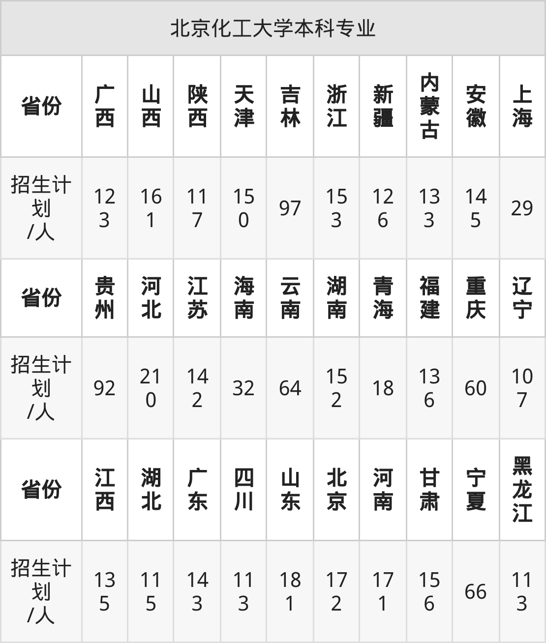北京化工大学面向天津(150人)、福建(136人)、辽宁(107人)、山西(161人)、甘肃(156人)、新疆(126人)、上海(29人)等30个地区开展本科招生。其中内蒙古、四川、河南、新疆、陕西招生批次为本科一批,其余省份为本科批。
