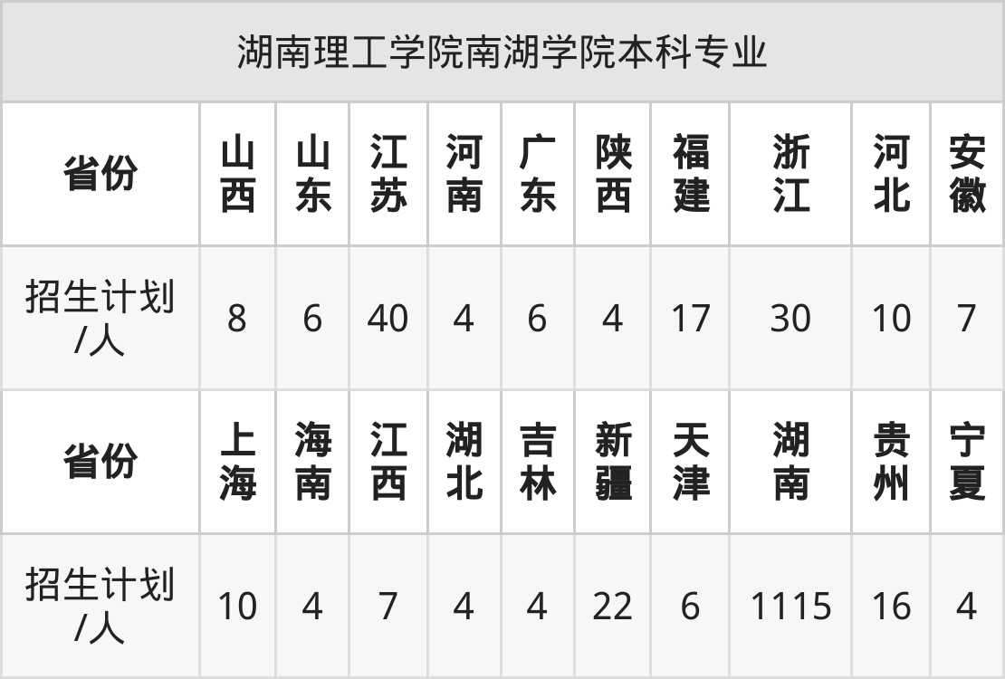 湖南理工学院南湖学院面向江苏(40人)、上海(10人)、湖北(4人)、湖南(1115人)、河北(10人)、浙江(30人)、广东(6人)等20个地区开展本科招生。其中河南、陕西、新疆招生批次为本科二批,其余省份为本科批。