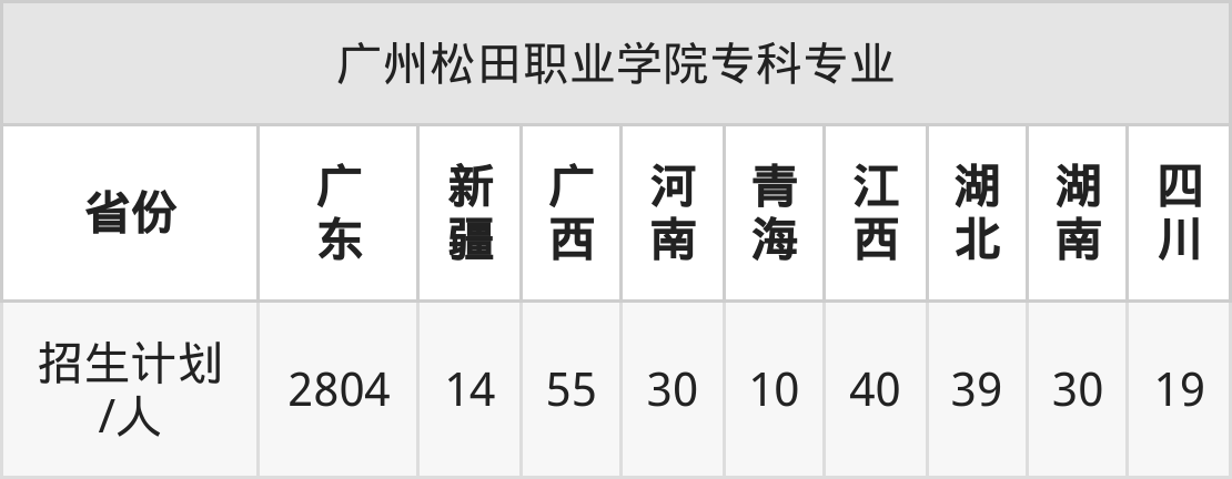 广州松田职业学院面向新疆(14人)、广西(55人)、湖北(39人)、广东(2804人)、四川(19人)、青海(10人)、江西(40人)等9个地区开展专科招生。招生批次为专科批。