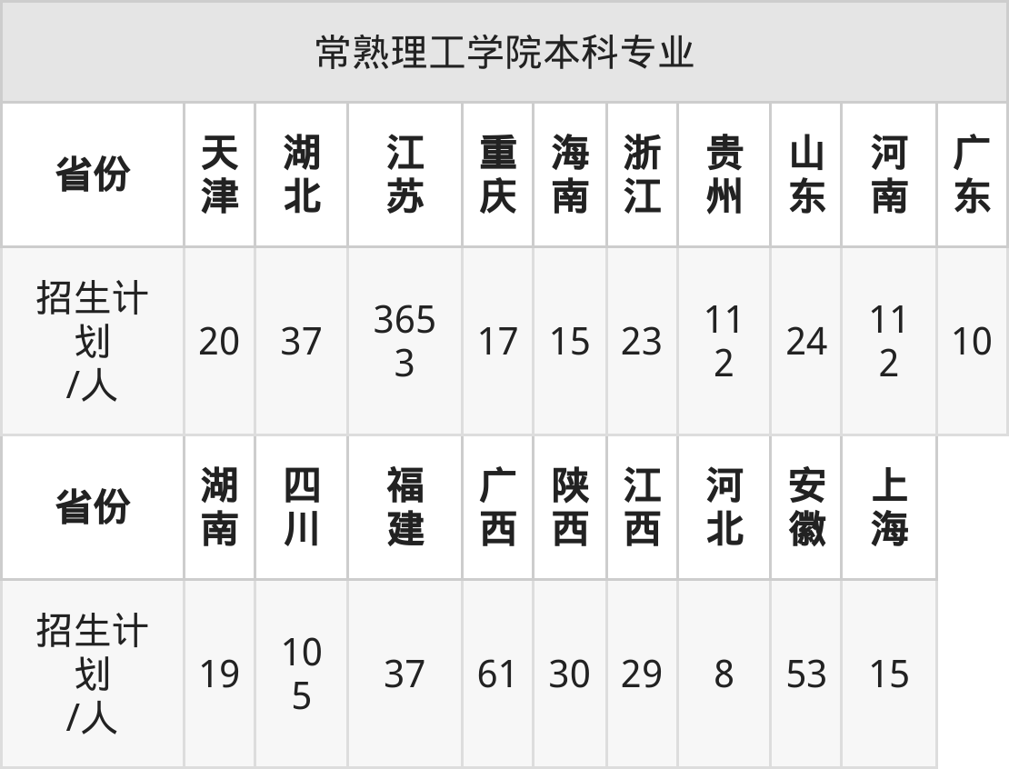 常熟理工学院面向河北(8人)、重庆(17人)、贵州(112人)、广西(61人)、上海(15人)、湖北(37人)、海南(15人)等19个地区开展本科招生。其中天津招生批次为本科批A段,陕西、河南、四川招生批次为本科二批,其余省份为本科批。
