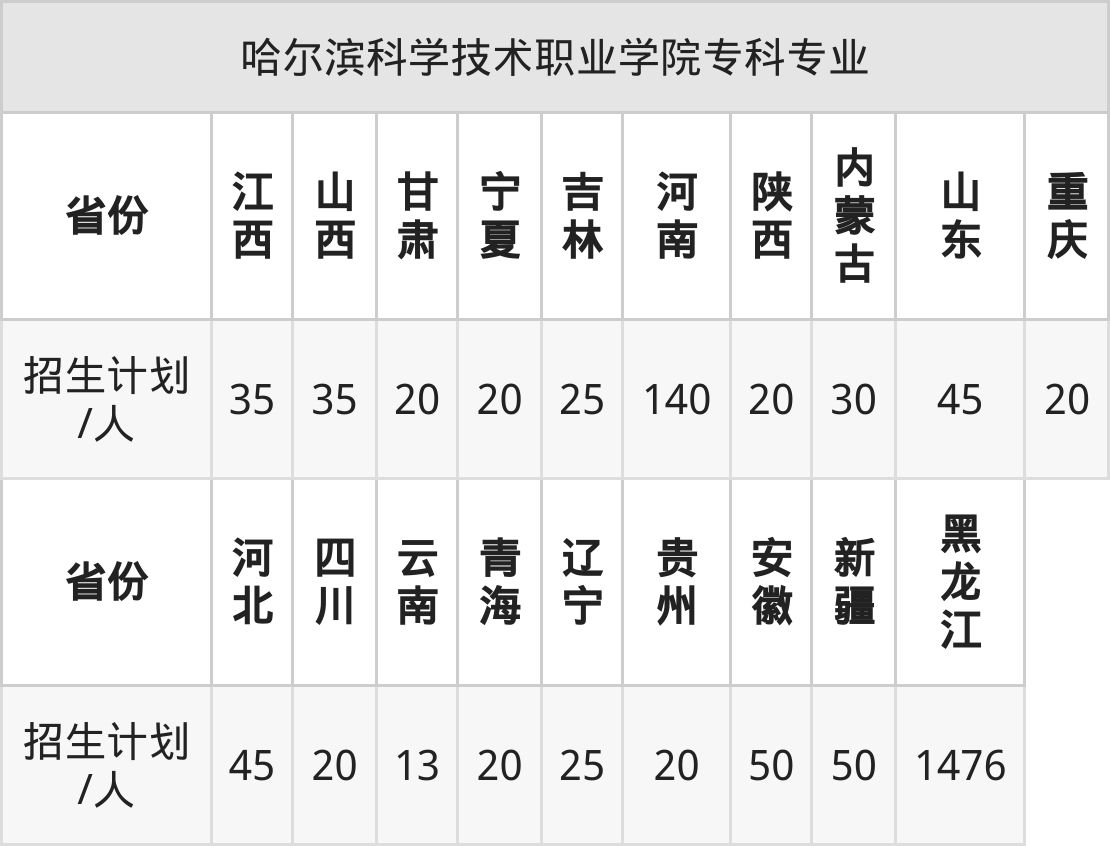 哈尔滨科学技术职业学院面向山东(45人)、甘肃(20人)、河北(45人)、山西(35人)、宁夏(20人)、云南(13人)、江西(35人)等19个地区开展专科招生。其中山东招生批次为二段,其余省份为专科批。