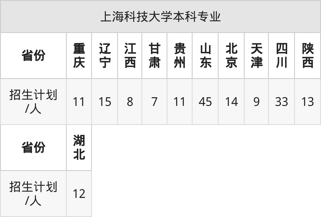 上海科技大学面向甘肃(7人)、北京(14人)、贵州(11人)、四川(33人)、天津(9人)、陕西(13人)、辽宁(15人)等11个地区开展本科招生。其中天津、甘肃、北京、重庆、贵州招生批次为本科提前批A,其余省份为本科提前批。