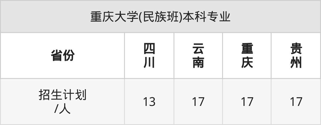 重庆大学(民族班)面向贵州(17人)、四川(13人)、云南(17人)、重庆(17人)开展本科招生。其中云南招生批次为一本,其余省份为本科批。
