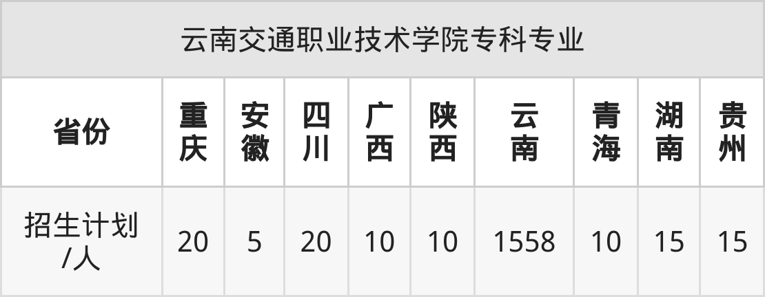 云南交通职业技术学院面向贵州(15人)、陕西(10人)、广西(10人)、云南(1558人)、青海(10人)、湖南(15人)、重庆(20人)等9个地区开展专科招生。招生批次为专科批。