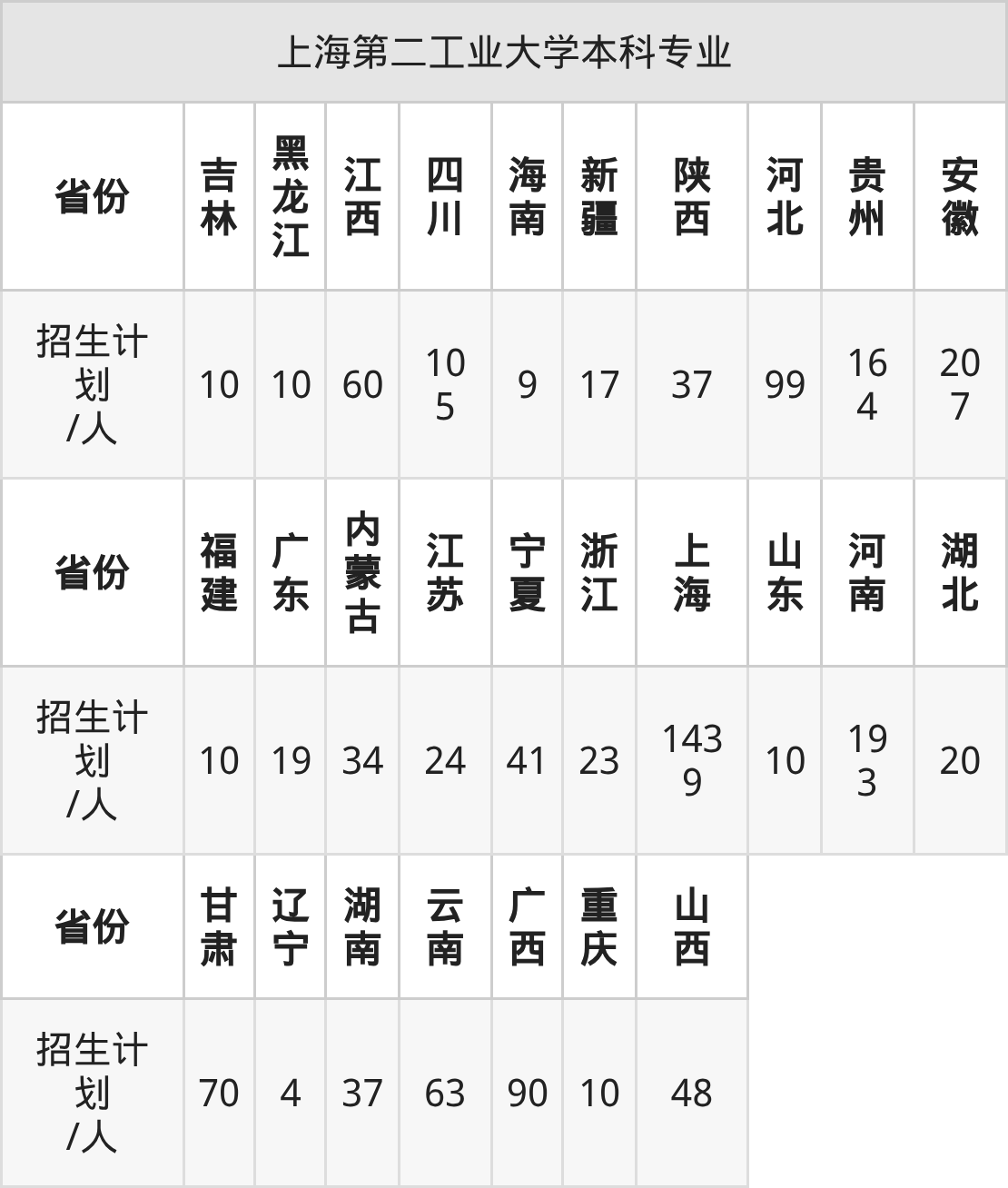 上海第二工业大学面向新疆(17人)、山西(48人)、陕西(37人)、河北(99人)、贵州(164人)、安徽(207人)、黑龙江(10人)等27个地区开展本科招生。其中山东招生批次为一段,云南、宁夏、四川招生批次为本科批B段,其余省份为本科批。