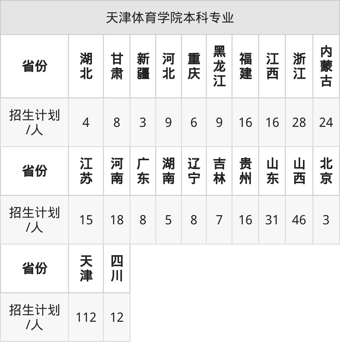 天津体育学院面向河南(18人)、吉林(7人)、江西(16人)、湖南(5人)、山西(46人)、广东(8人)、新疆(3人)等22个地区开展本科招生。其中北京招生批次为本科提前批A,四川、河南、新疆、内蒙古招生批次为本科二批,其余省份为本科批。