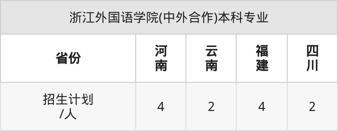 浙江外国语学院(中外合作)面向河南(4人)、云南(2人)、福建(4人)、四川(2人)开展本科招生。招生批次为二本。