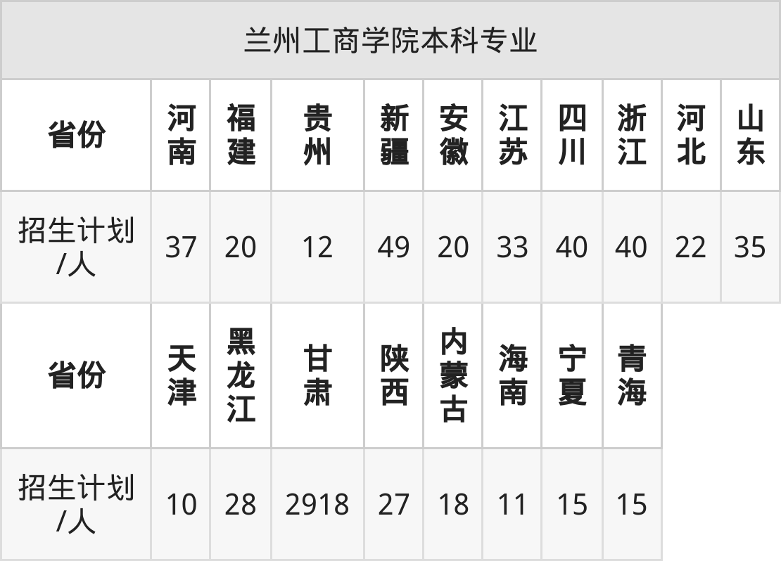 兰州工商学院面向陕西(27人)、新疆(49人)、山东(35人)、安徽(20人)、宁夏(15人)、河南(37人)、青海(15人)等18个地区开展本科招生。其中内蒙古、四川、新疆、陕西、河南招生批次为本科二批,其余省份为本科批。