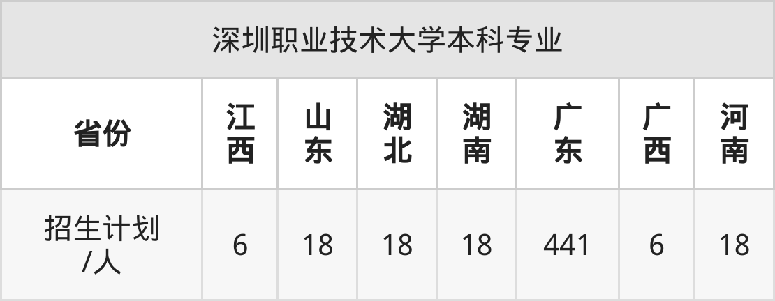 深圳职业技术大学面向湖南(18人)、广东(441人)、广西(6人)、河南(18人)、江西(6人)、山东(18人)、湖北(18人)等7个地区开展本科招生。其中山东招生批次为一段,其余省份为本科批。