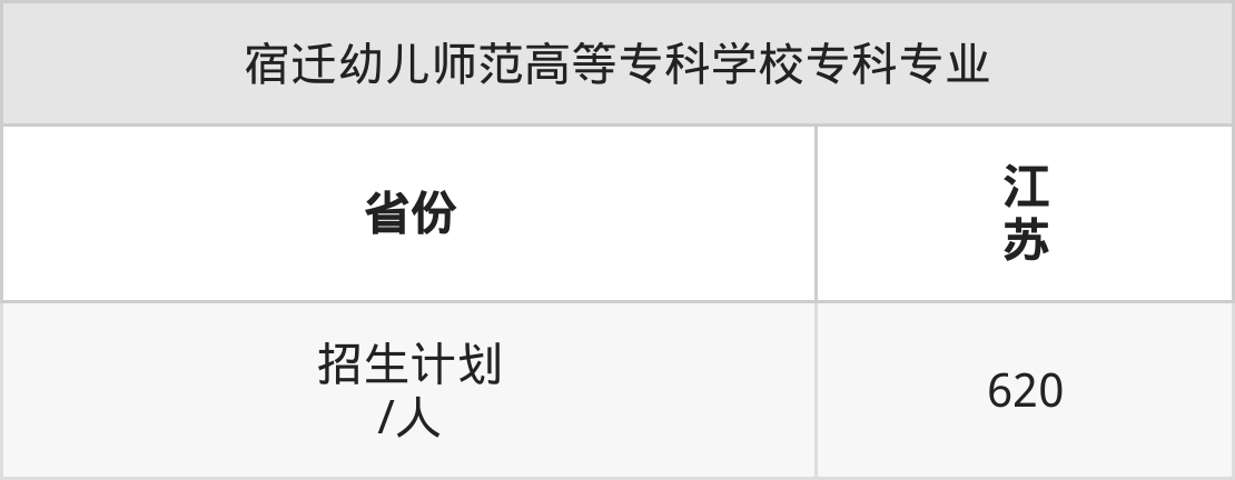宿迁幼儿师范高等专科学校面向江苏(620人)开展专科招生。招生批次为专科批。