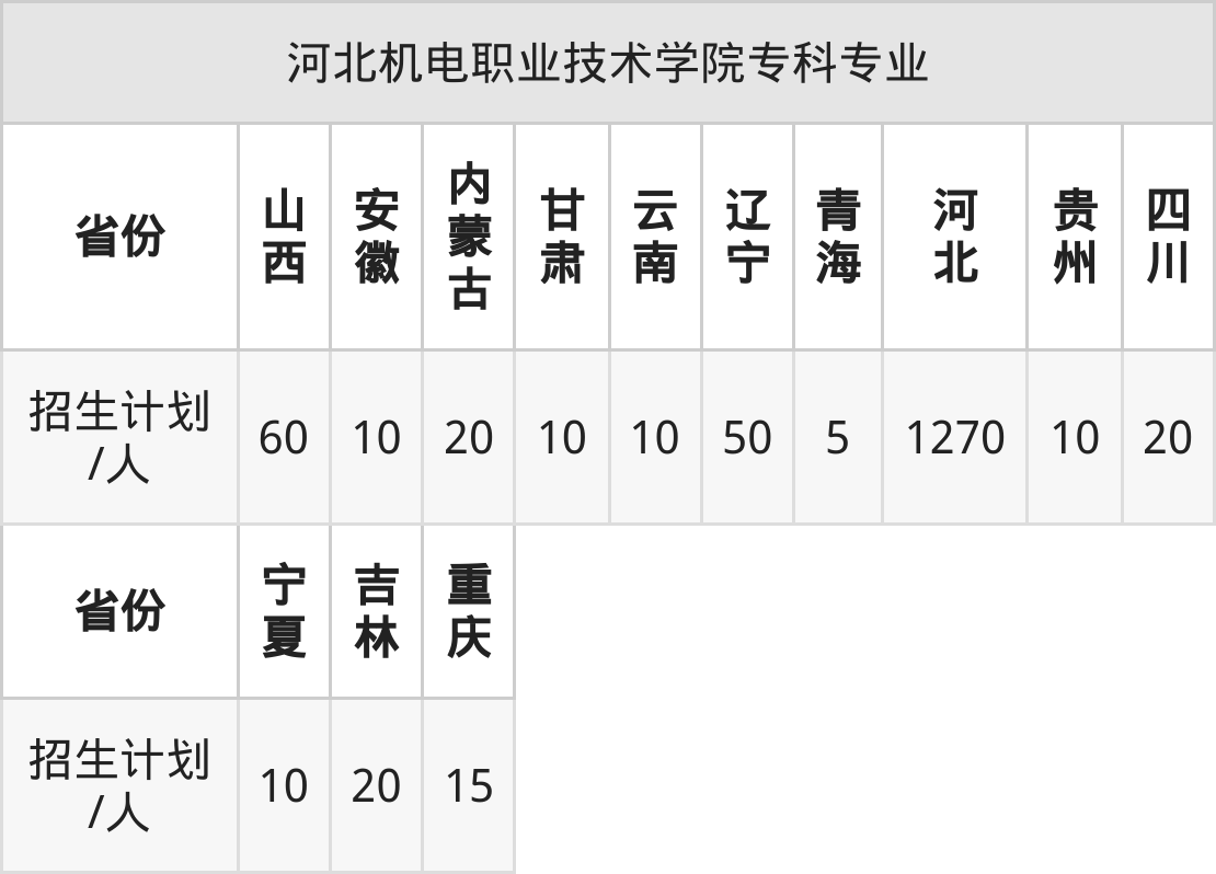 河北机电职业技术学院面向宁夏(10人)、云南(10人)、山西(60人)、贵州(10人)、四川(20人)、甘肃(10人)、辽宁(50人)等13个地区开展专科招生。招生批次为专科批。