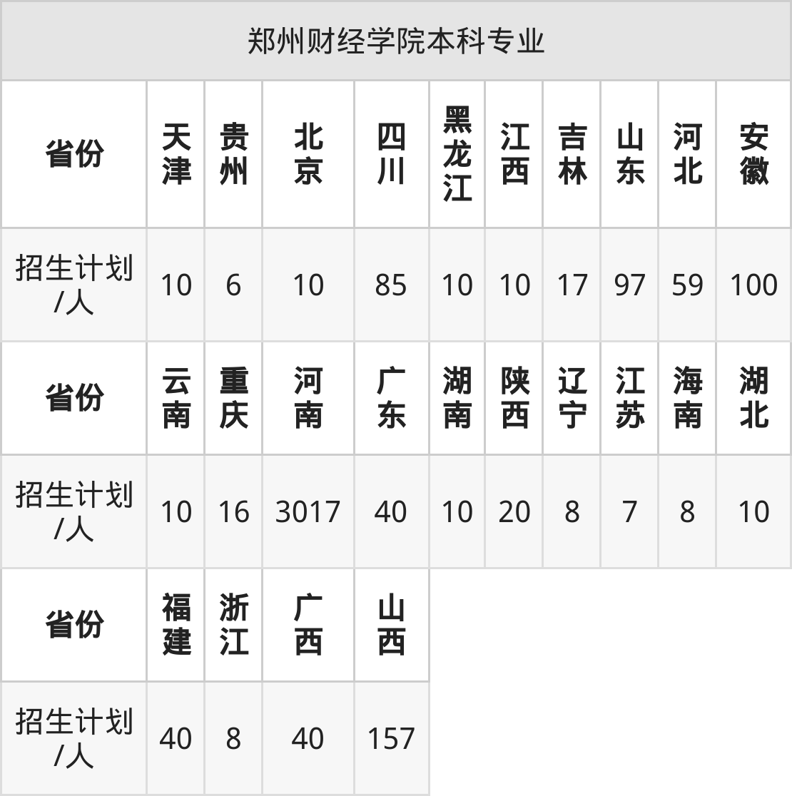 郑州财经学院面向四川(85人)、湖北(10人)、山西(157人)、云南(10人)、辽宁(8人)、广东(40人)、广西(40人)等24个地区开展本科招生。其中四川、陕西、河南招生批次为本科二批,其余省份为本科批。
