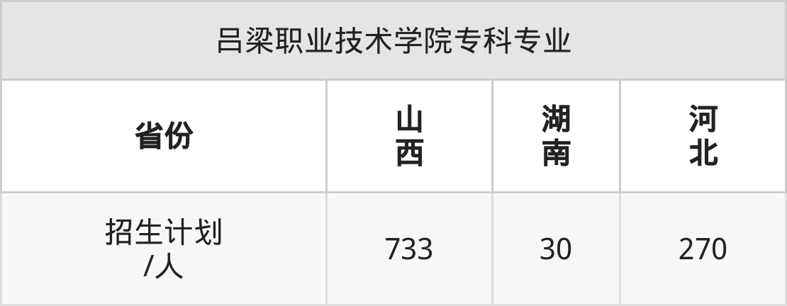吕梁职业技术学院面向湖南(30人)、河北(270人)、山西(733人)开展专科招生。招生批次为专科批。