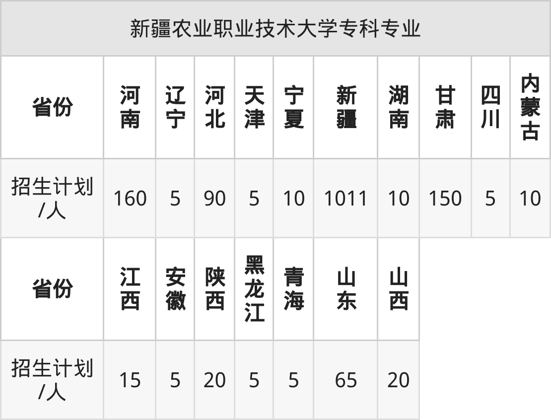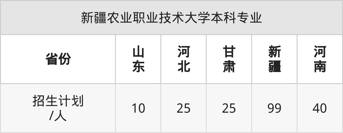 新疆农业职业技术大学面向山东(10人)、河北(25人)、甘肃(25人)、新疆(99人)、河南(40人)开展本科招生。其中山东招生批次为一段,其余省份为本科二批。