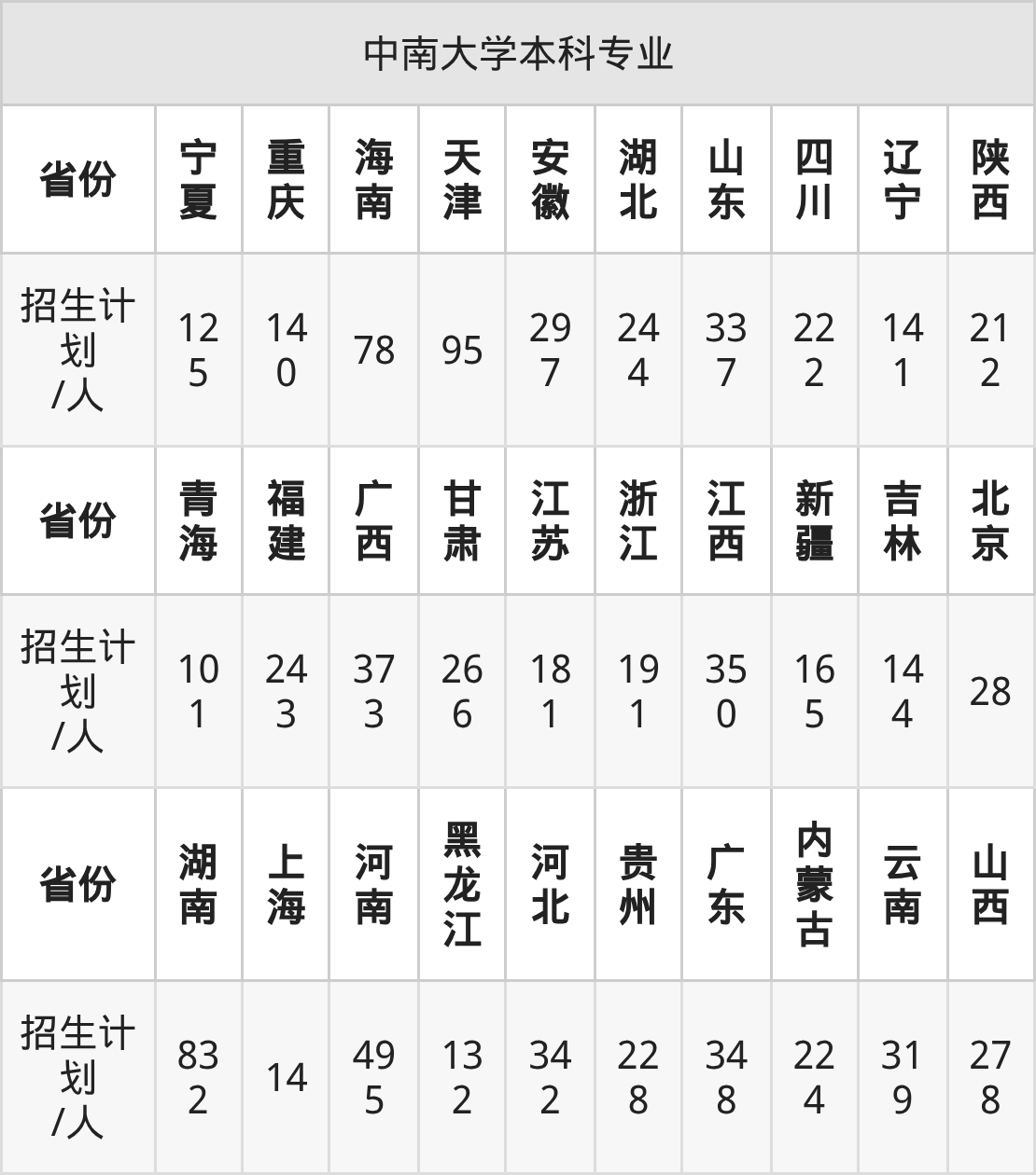中南大学面向宁夏(125人)、山西(278人)、安徽(297人)、甘肃(266人)、上海(14人)、黑龙江(132人)、辽宁(141人)等30个地区开展本科招生。其中四川、云南、宁夏招生批次为本科批B段,其余省份为本科批。