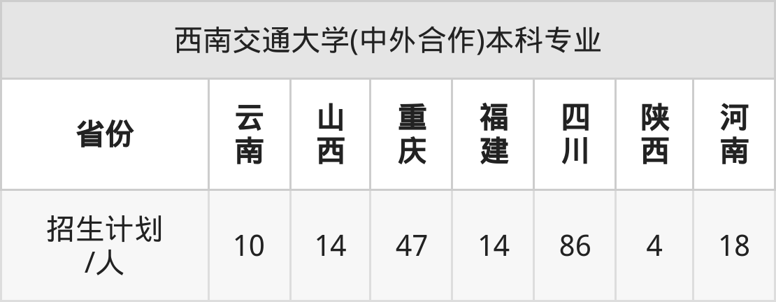 西南交通大学(中外合作)面向福建(14人)、四川(86人)、陕西(4人)、河南(18人)、云南(10人)、山西(14人)、重庆(47人)等7个地区开展本科招生。其中山西招生批次为第一批本科A1类,重庆、福建招生批次为本科批,其余省份为本科一批。