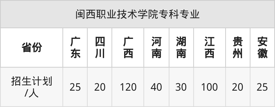 闽西职业技术学院面向四川(20人)、广西(120人)、河南(40人)、湖南(30人)、江西(100人)、贵州(20人)、安徽(25人)等8个地区开展专科招生。招生批次为专科批。