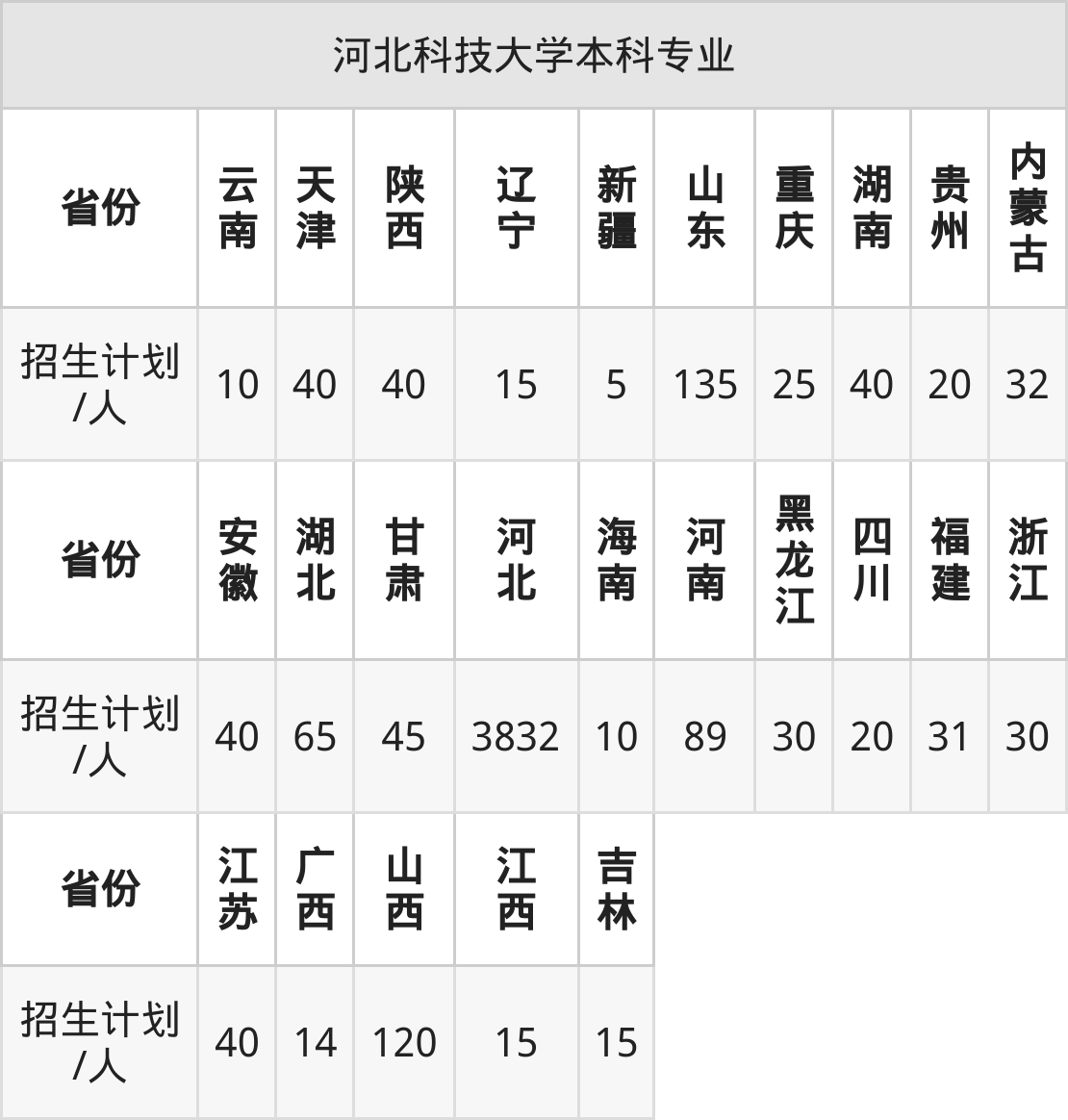河北科技大学面向贵州(20人)、浙江(30人)、新疆(5人)、甘肃(45人)、云南(10人)、河北(3832人)、山西(120人)等25个地区开展本科招生。其中山东招生批次为一段,四川、新疆、陕西、内蒙古、河南招生批次为本科二批,其余省份为本科批。