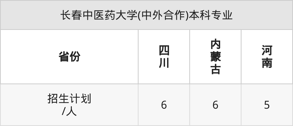 长春中医药大学(中外合作)面向四川(6人)、内蒙古(6人)、河南(5人)开展本科招生。招生批次为本科二批。
