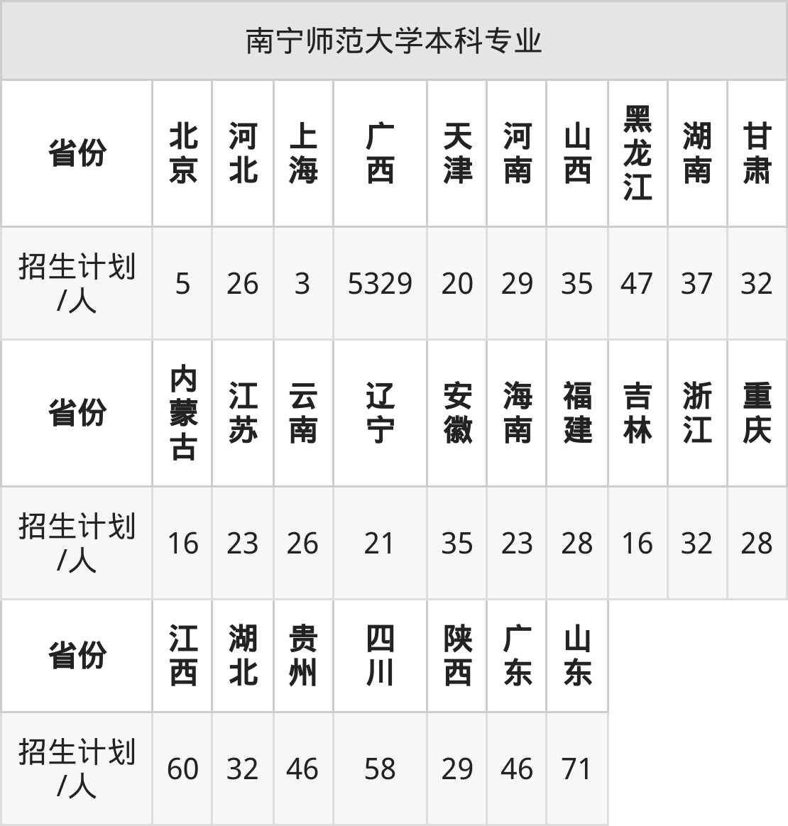 南宁师范大学面向江西(60人)、重庆(28人)、内蒙古(16人)、山西(35人)、陕西(29人)、甘肃(32人)、云南(26人)等27个地区开展本科招生。其中山东招生批次为一段,四川、河南、内蒙古、陕西招生批次为本科二批,其余省份为本科批。