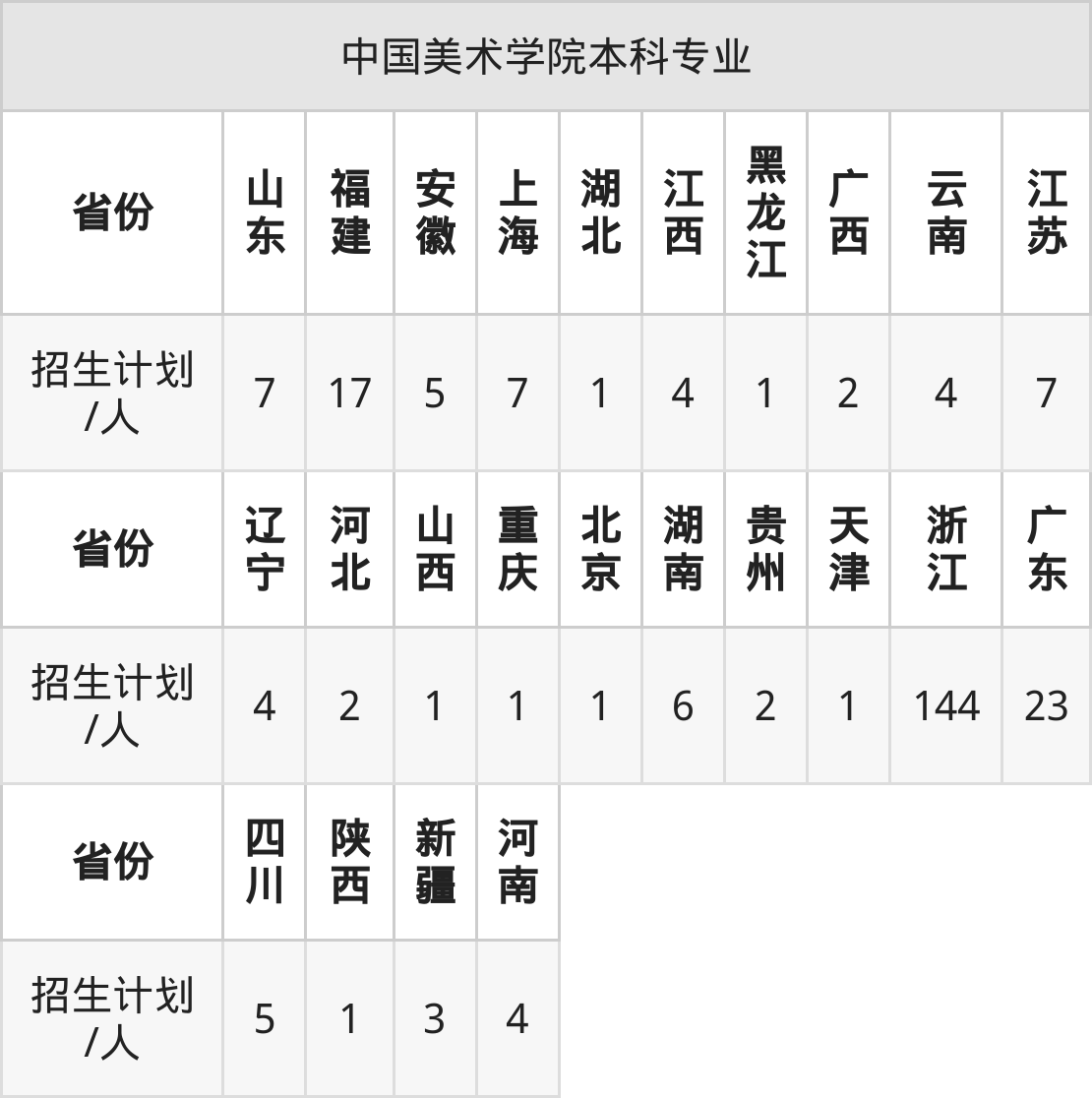 中国美术学院面向湖北(1人)、贵州(2人)、天津(1人)、安徽(5人)、黑龙江(1人)、江苏(7人)、江西(4人)等24个地区开展本科招生。其中云南招生批次为一本,陕西、新疆、河南、四川招生批次为本科一批,其余省份为本科批。