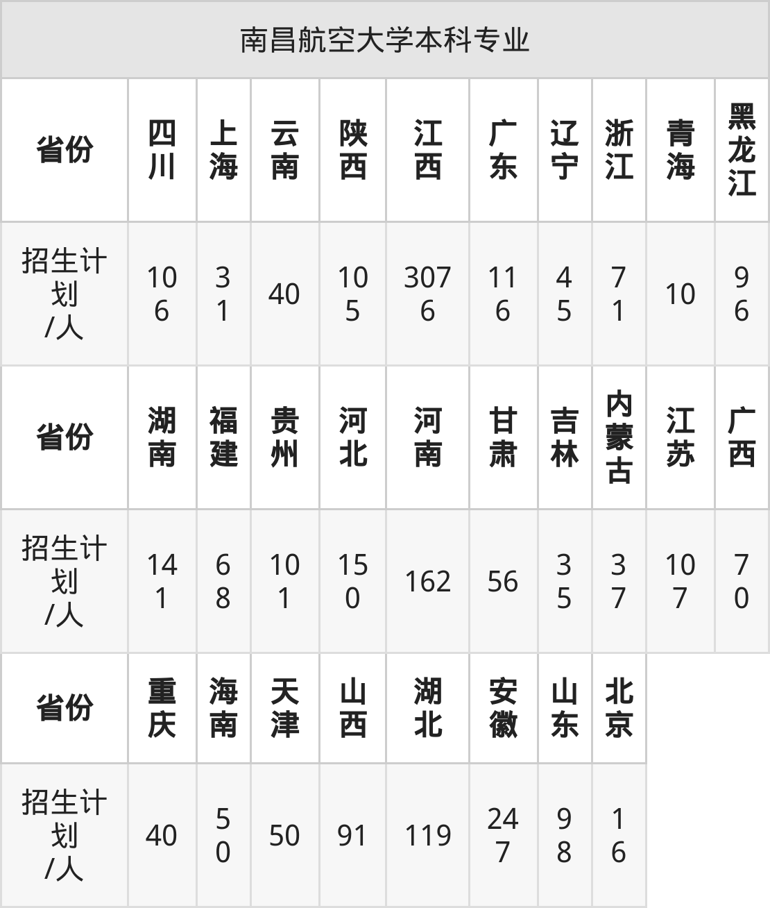 南昌航空大学面向浙江(71人)、安徽(247人)、四川(106人)、辽宁(45人)、山西(91人)、贵州(101人)、黑龙江(96人)等28个地区开展本科招生。其中河南、陕西、四川招生批次为本科二批,其余省份为本科批。